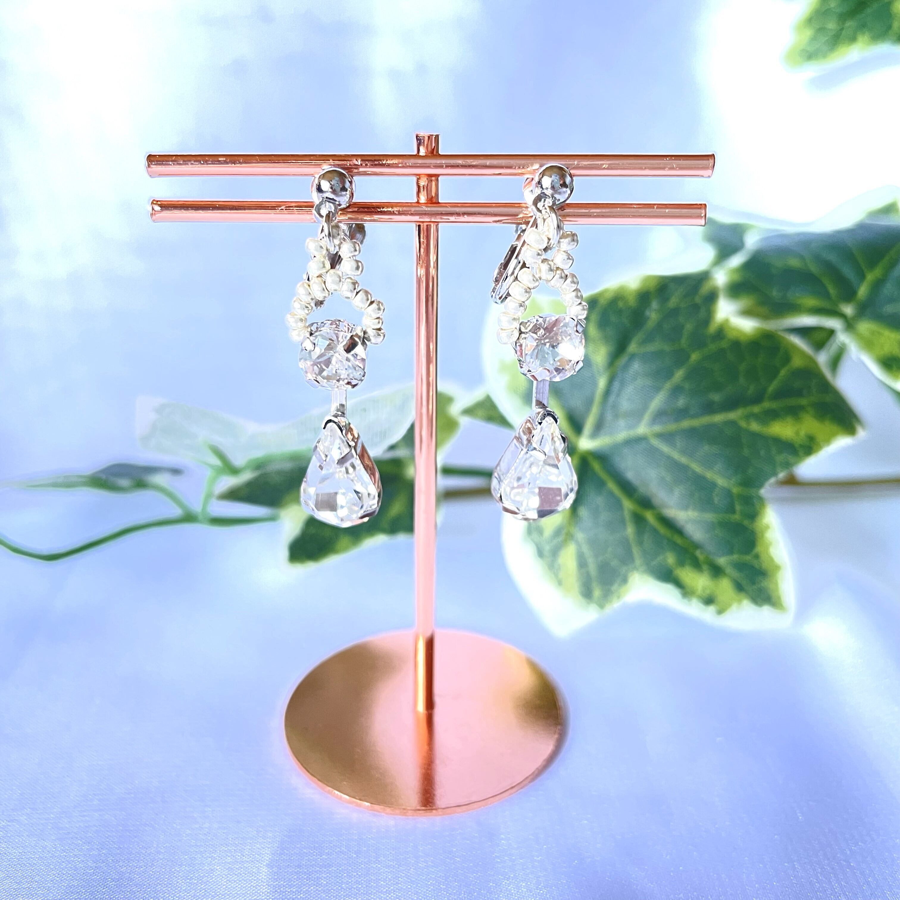 素材・色:クリスタル連バー(ドロップ 2㎝)、TOHO丸小ビーズ、ばね式イヤリング金具(ロジウムカラー、真鍮)