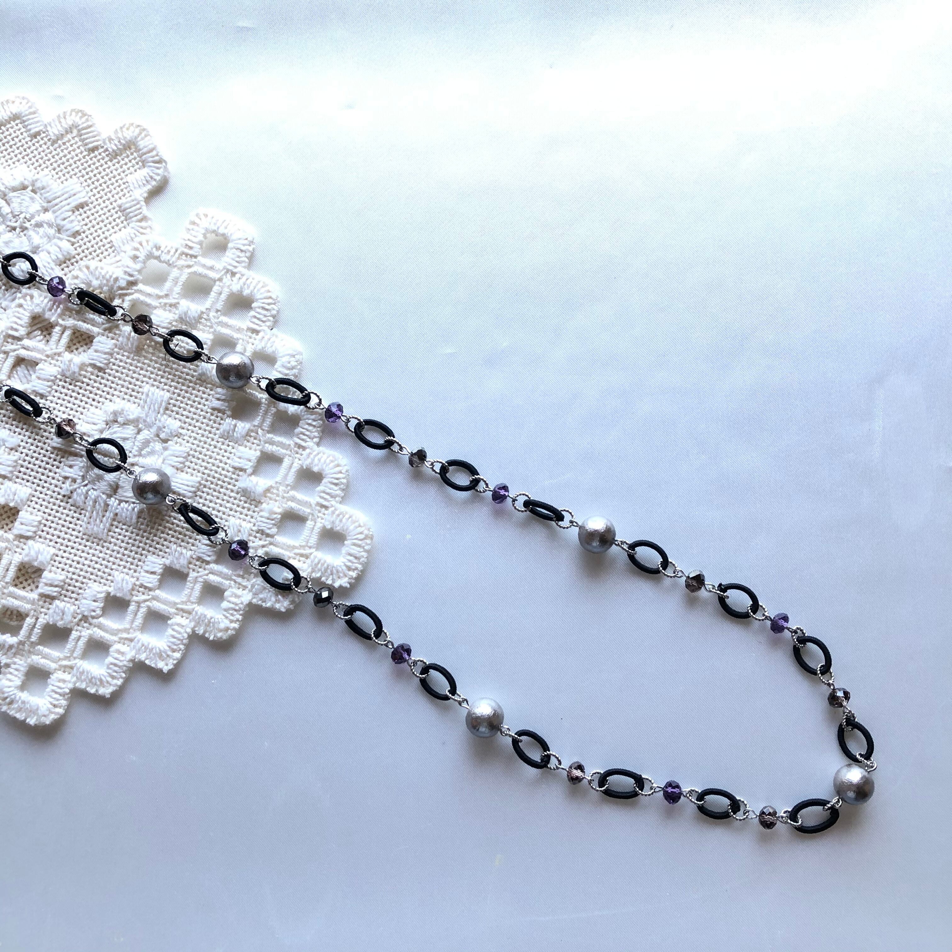素材・色:コットンパール(グレー)、エアリーチェーン(ブラック)、ガラスビーズ(パープル・ブラック)、デザイン金具(シルバー)、マグネット金具(シルバー)