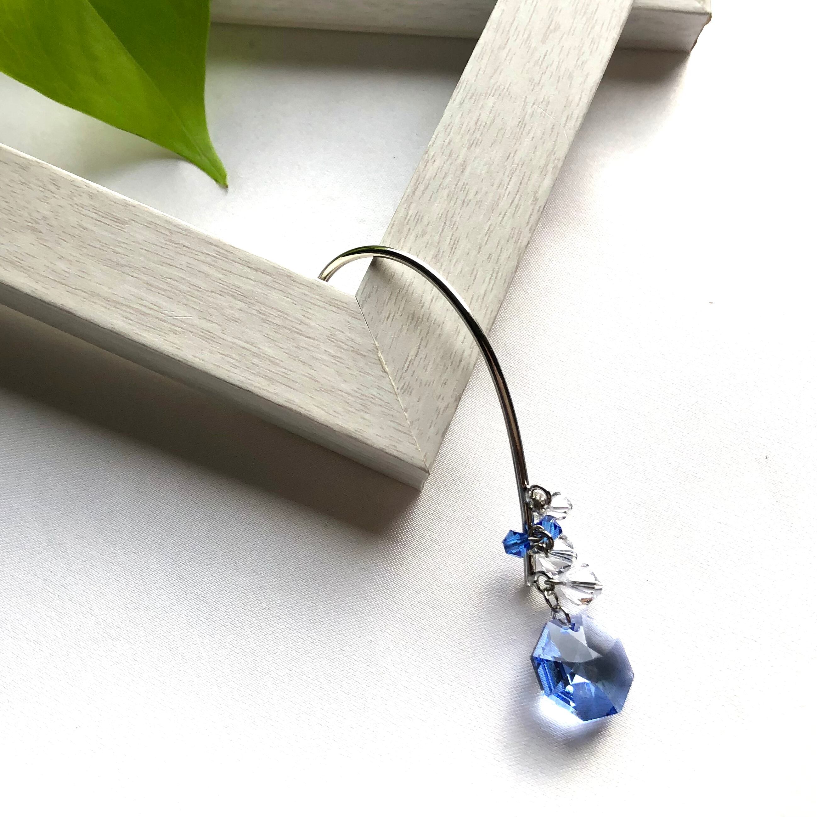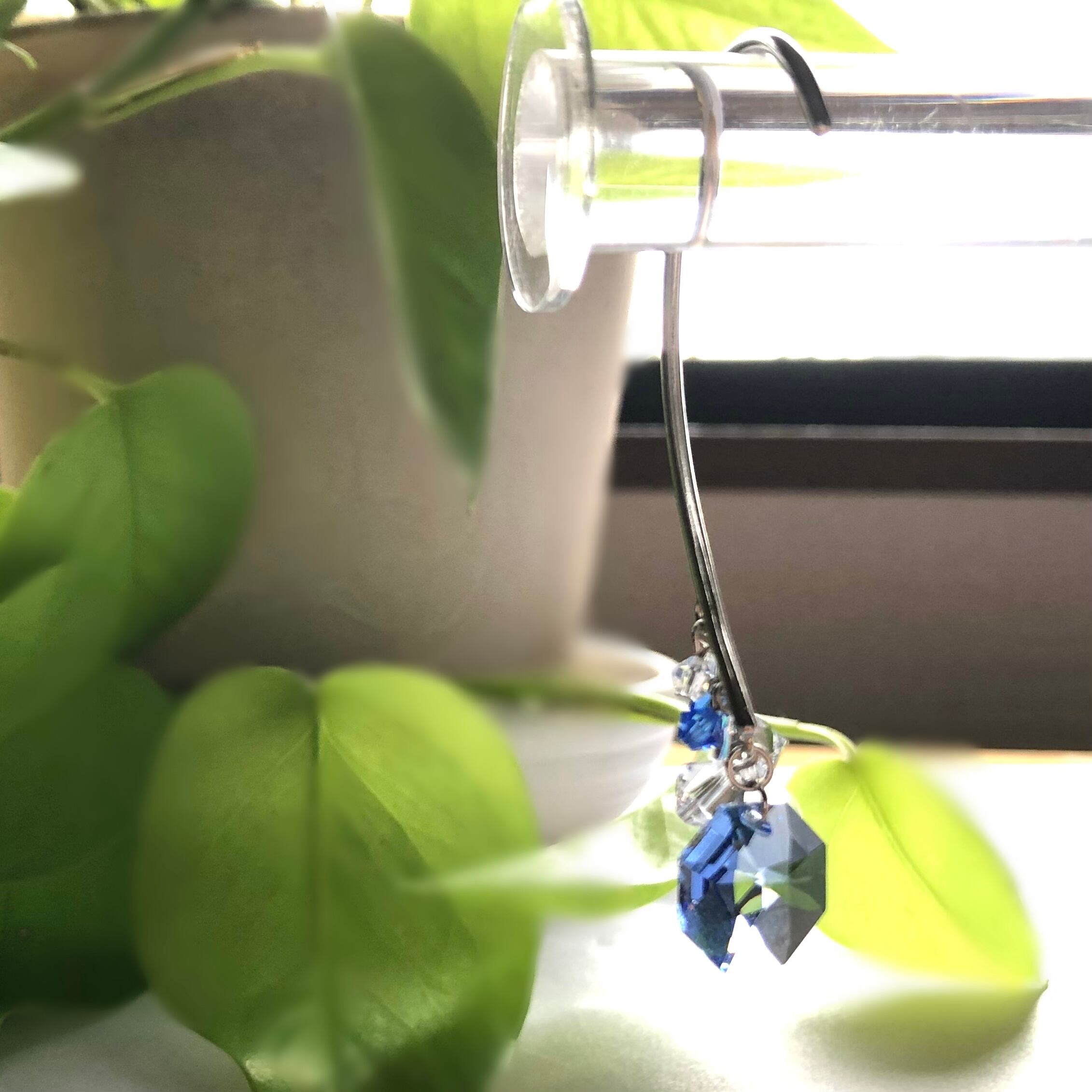 素材:貴和クリスタルオクタゴン14㎜/ミディアムサファイア、貴和クリスタルソロバン型6㎜クリスタル・4㎜クリスタル・サファイア、イヤーフック(シルバーカラー:真鍮)