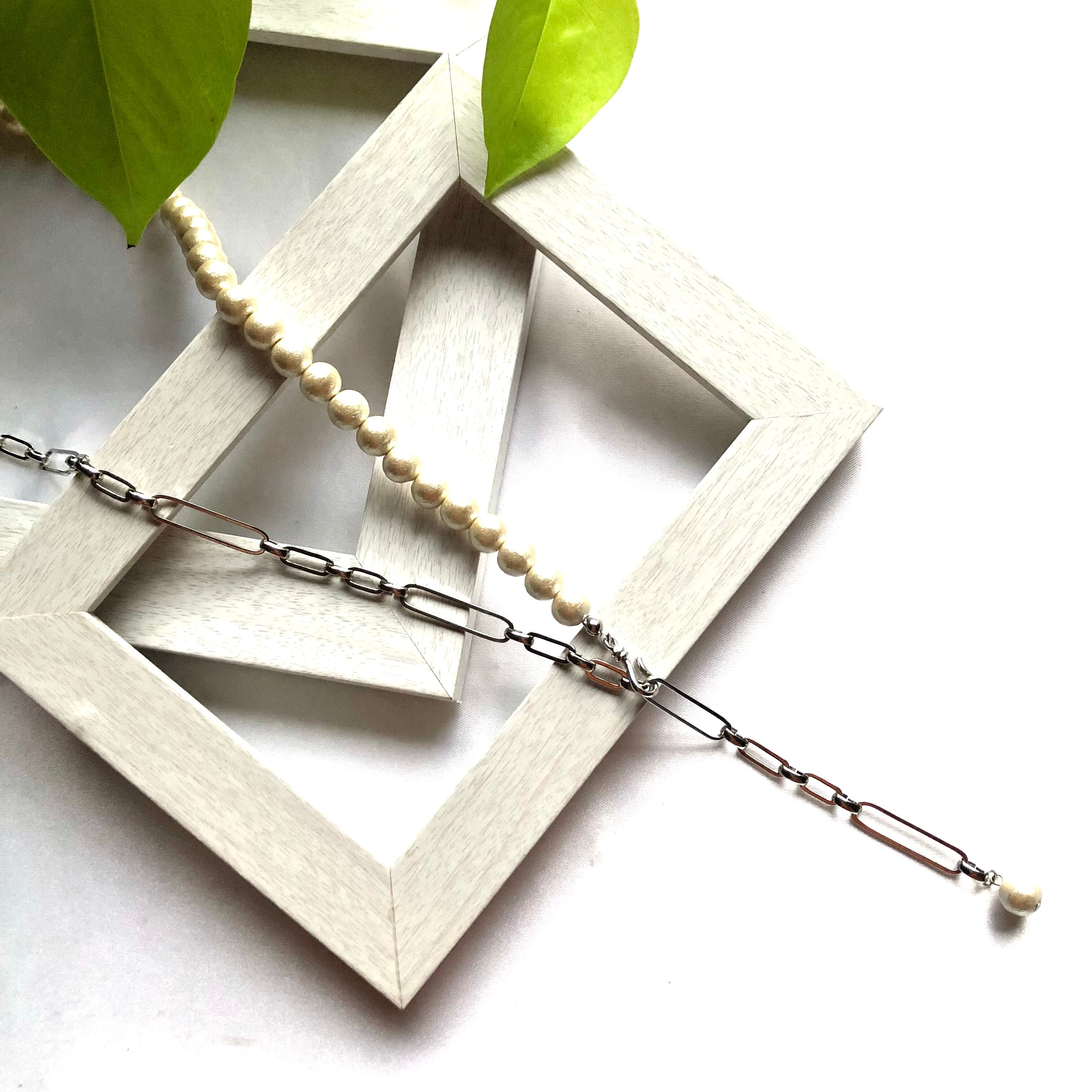 今年流行のデザインチェーンとコットンパールのコンビネックレス。フック金具を使用することで片手でも簡単につけ外しができる、というだけでなく4ウェイのアレンジが可能になりました。