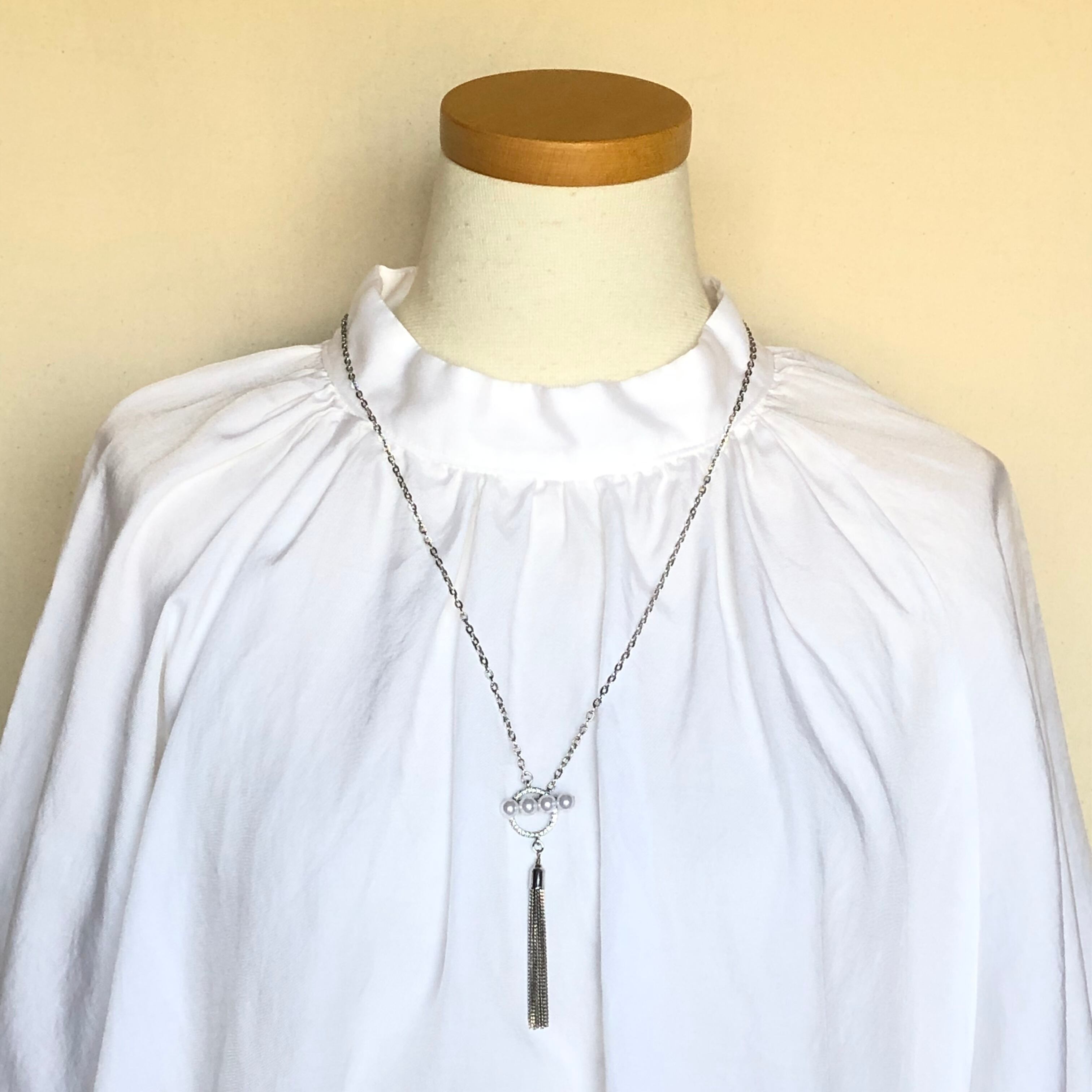 流行りのマンテル風デザインをポイントにしたチェーンタッセルペンダント。