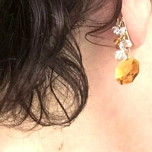 素材:貴和クリスタルオクタゴン14㎜/トパーズ、貴和クリスタルソロバン型6㎜クリスタル・4㎜クリスタル・トパーズ、イヤーフック(シルバーカラー:真鍮)