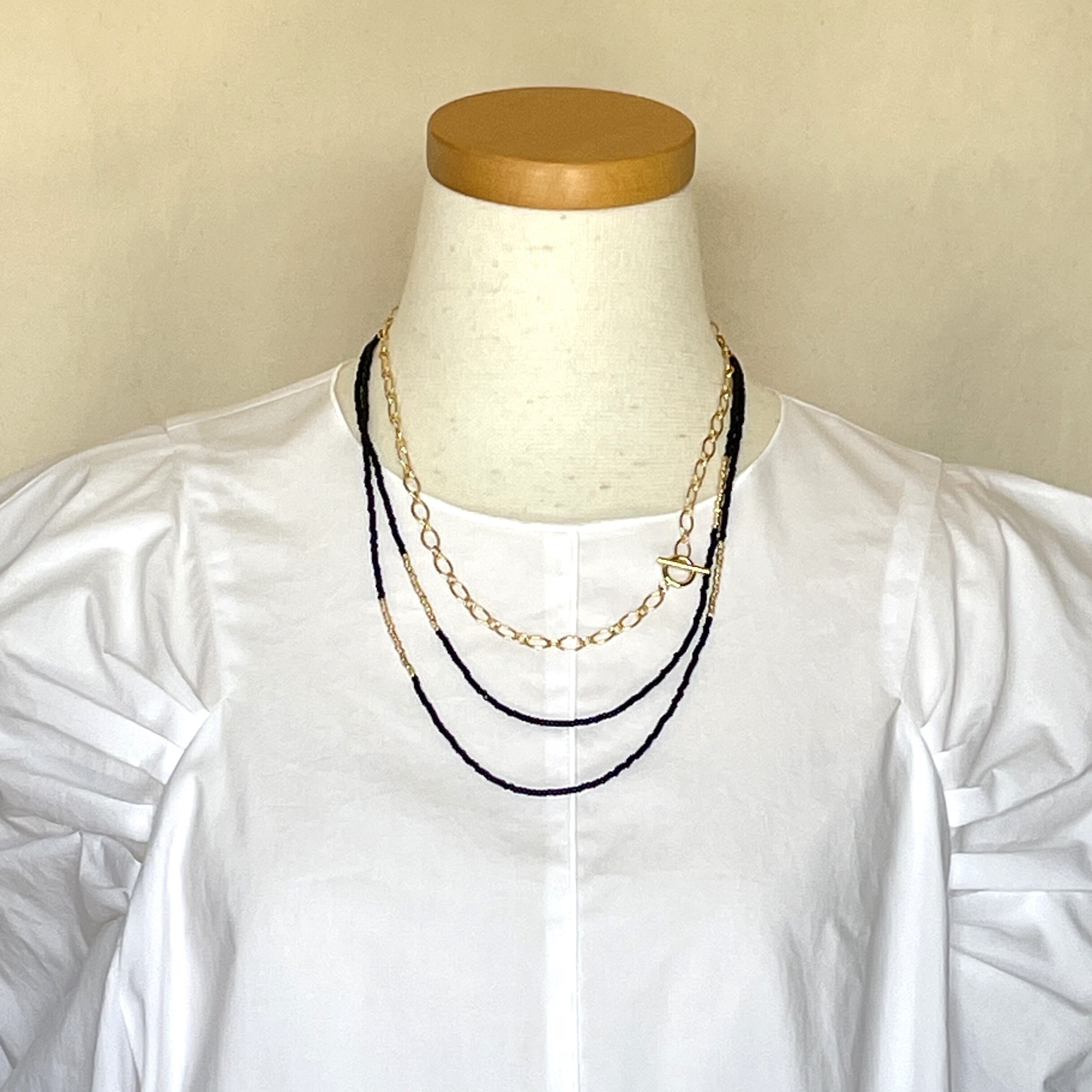 ところどころに配したゴールドのスリーカットビーズはPF加工がされており、色落ちがしにくいのが特徴です。間にスリーカットビーズを使用していることで、大人のシンプルカジュアルを演出できます。
