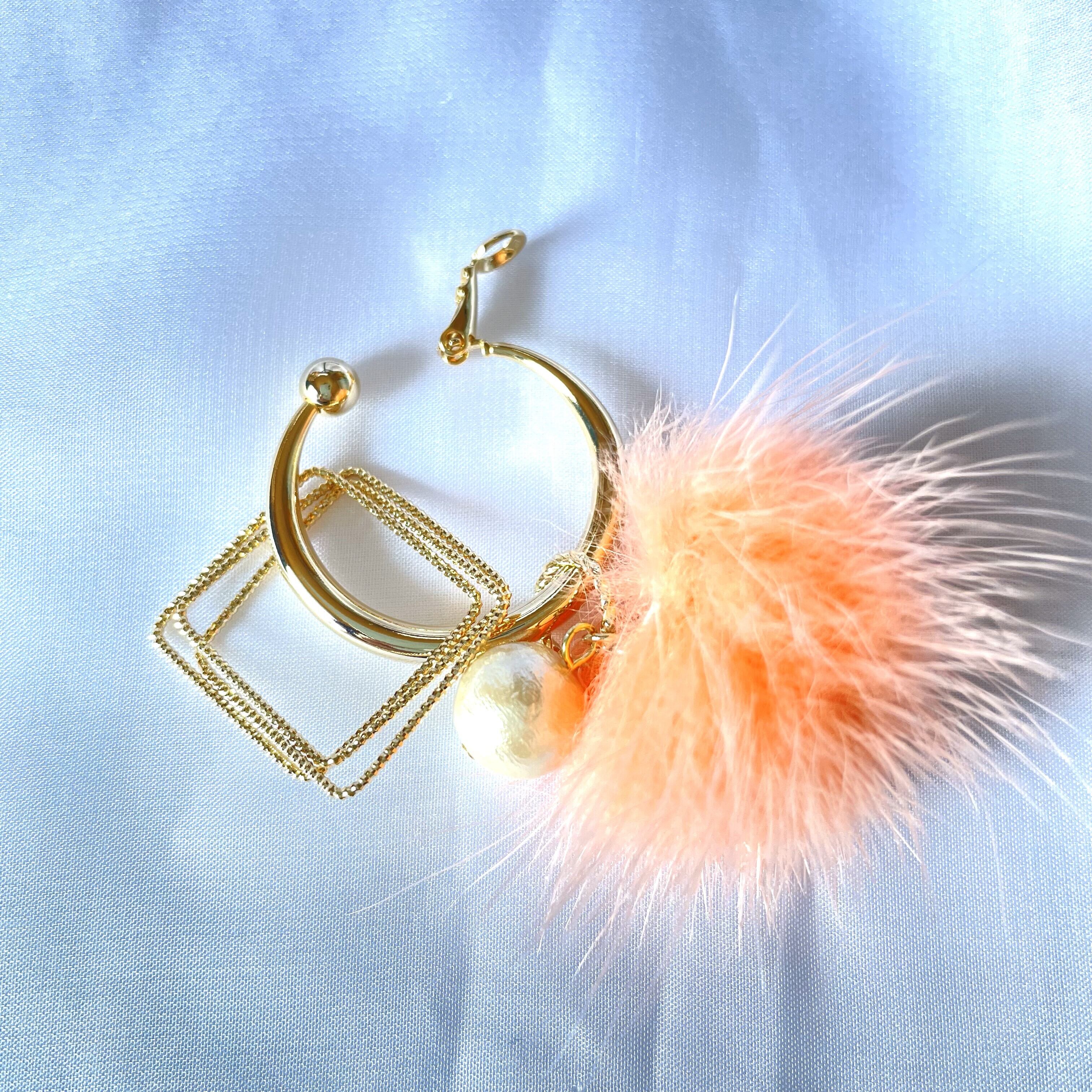 素材・色:ミンクファー 約30㎜(ピーチ )、コットンパール10㎜(キスカ)、メタルリングパーツ(真鍮、30㎜)、フープ型ばね式イヤリング金具(30㎜、太さ3㎜、ゴールドカラー、真鍮)