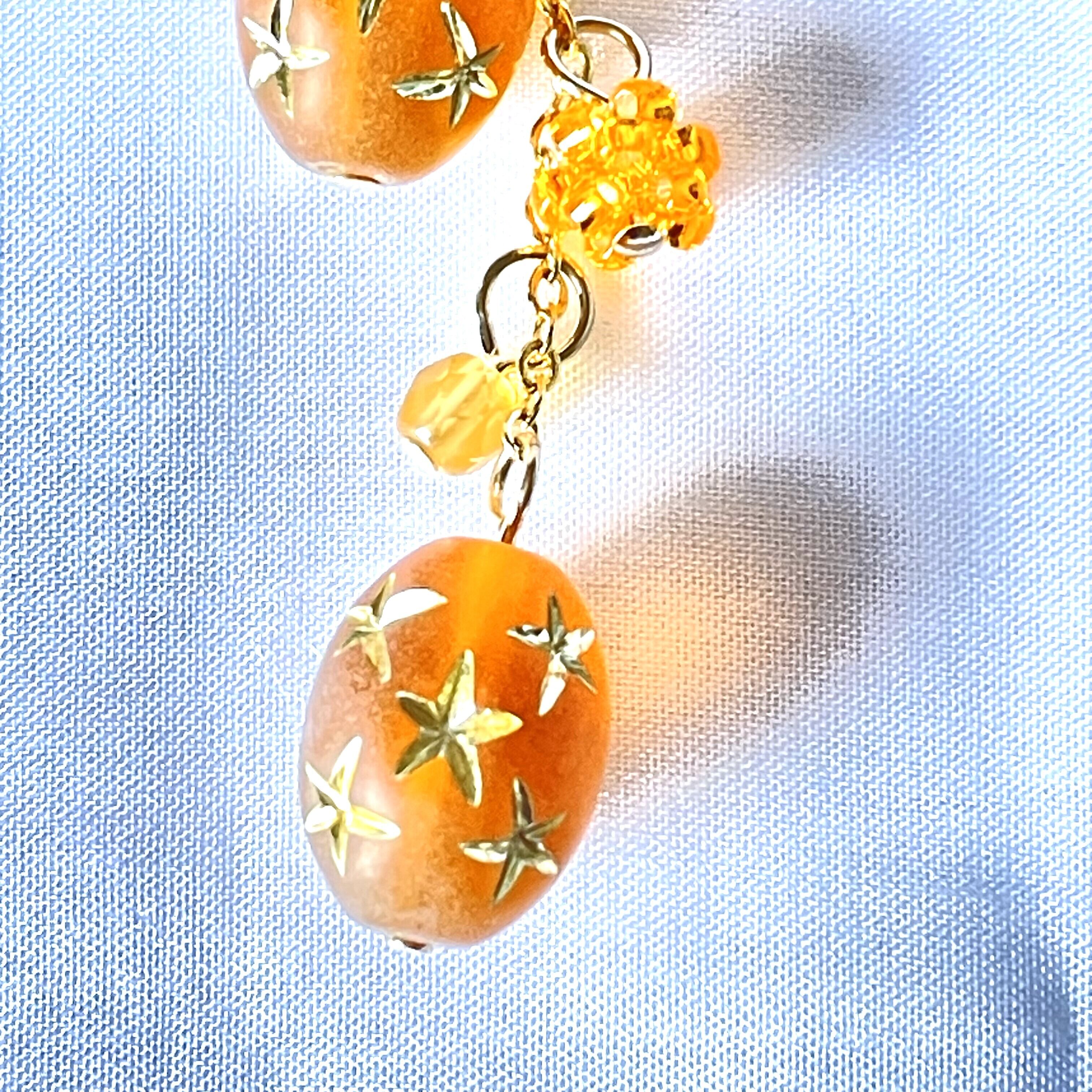 素材・色:イヤーフック(ゴールドカラー:真鍮)、アクリルビーズ(オレンジ 15㎜×10㎜)、チェコファイヤーポリッシュ4㎜(オレンジ)、丸小ビーズ(オレンジ)、チェーン(真鍮)