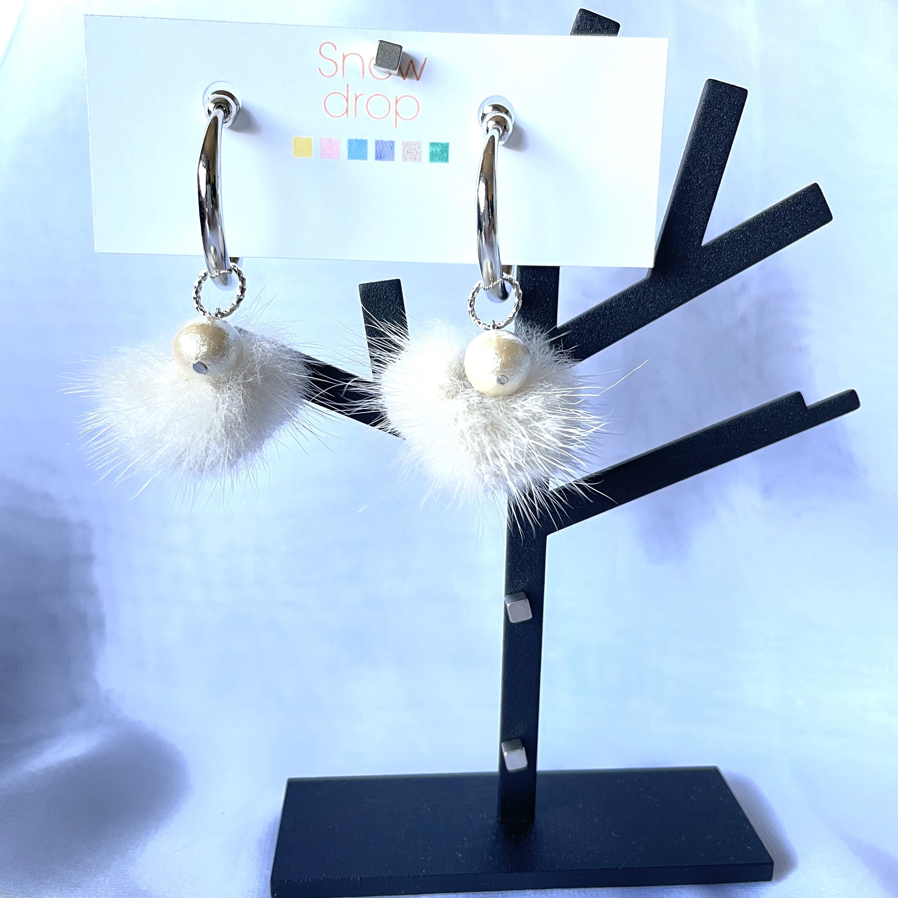 素材・色:ミンクファー 約30㎜(ネイビー)、コットンパール10㎜(キスカ)、メタルリングパーツ(真鍮、30㎜)、フープ型ばね式イヤリング金具(30㎜、太さ3㎜、ロジウムカラー、真鍮)