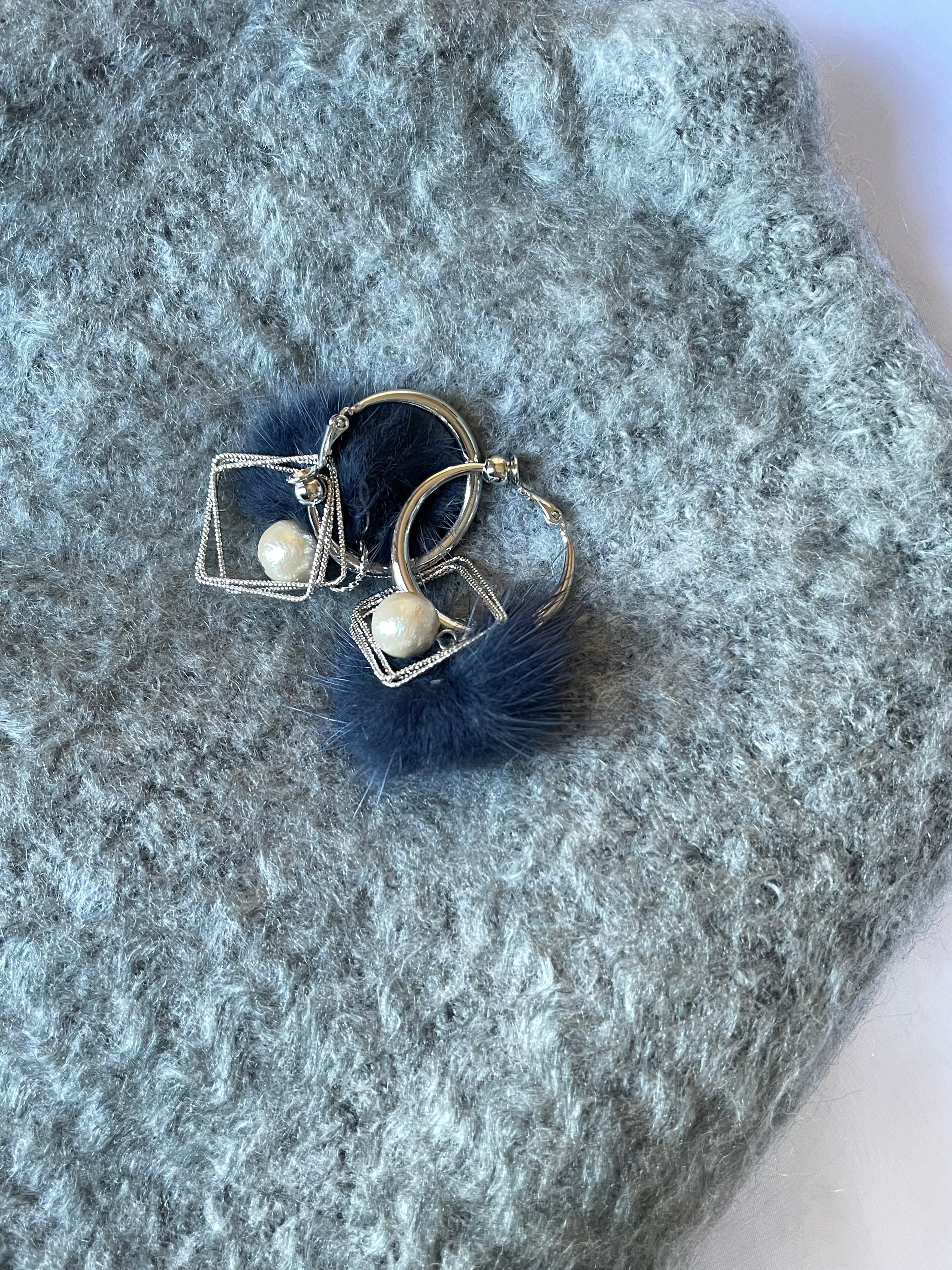 素材・色:ミンクファー(3色のアソート) 約30㎜、コットンパール10㎜(キスカ)、コットンパール12㎜(バニラ)、メタルリングパーツ(真鍮、30㎜)、フープ型ばね式イヤリング金具(30㎜、太さ3㎜、シルバーカラー、真鍮)
