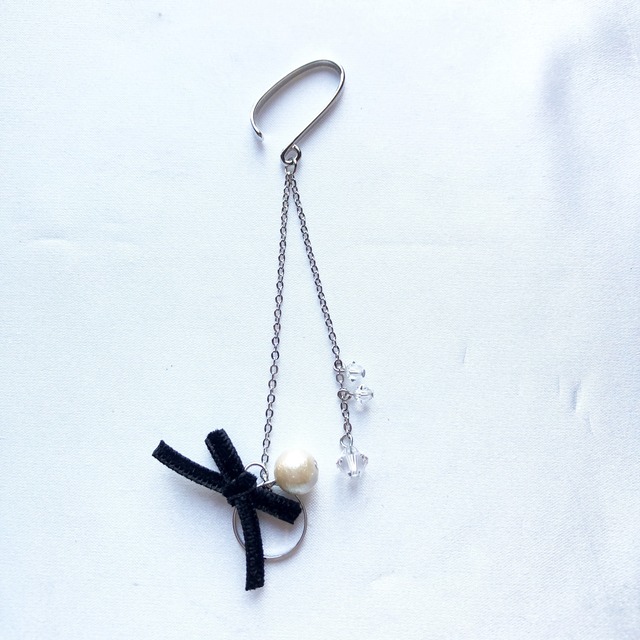 イヤリングやピアスが苦手、片手で着けるのも大変 だけど耳元のアクセサリーを楽しみたいという方のために イヤーフックをお作りしました。 ボリュームのある14㎜オクタゴン(8角形)のクリスタルガラスを使っているので 片耳でも存在感のあるイヤーアクセサリーとして 楽しんでいただけます。 耳たぶに当たる部分には貴和クリスタルソロバン型ビーズを鈴なりに配し、 きらきらと輝く華やかさを演出してくれます。 前からだけでなく後ろから見た姿も素敵です。 この作品は耳にかけて装着していただくものなので、マスク着脱時にはゴムに引っかかって落ちてしまうことがあります。着脱時の取り扱いにはご注意ください。 ※着画はイメージ写真のため、色が違っています。 素材:貴和クリスタルオクタゴン14㎜/ミディアムサファイア、貴和クリスタルソロバン型6㎜クリスタル・4㎜クリスタル・サファイア、イヤーフック(シルバーカラー:真鍮) 長さ:(フック上部から)全長7㎝ 重量:4g(1円玉4枚ほどの重さです) ※イヤーフックは片方のみの販売です